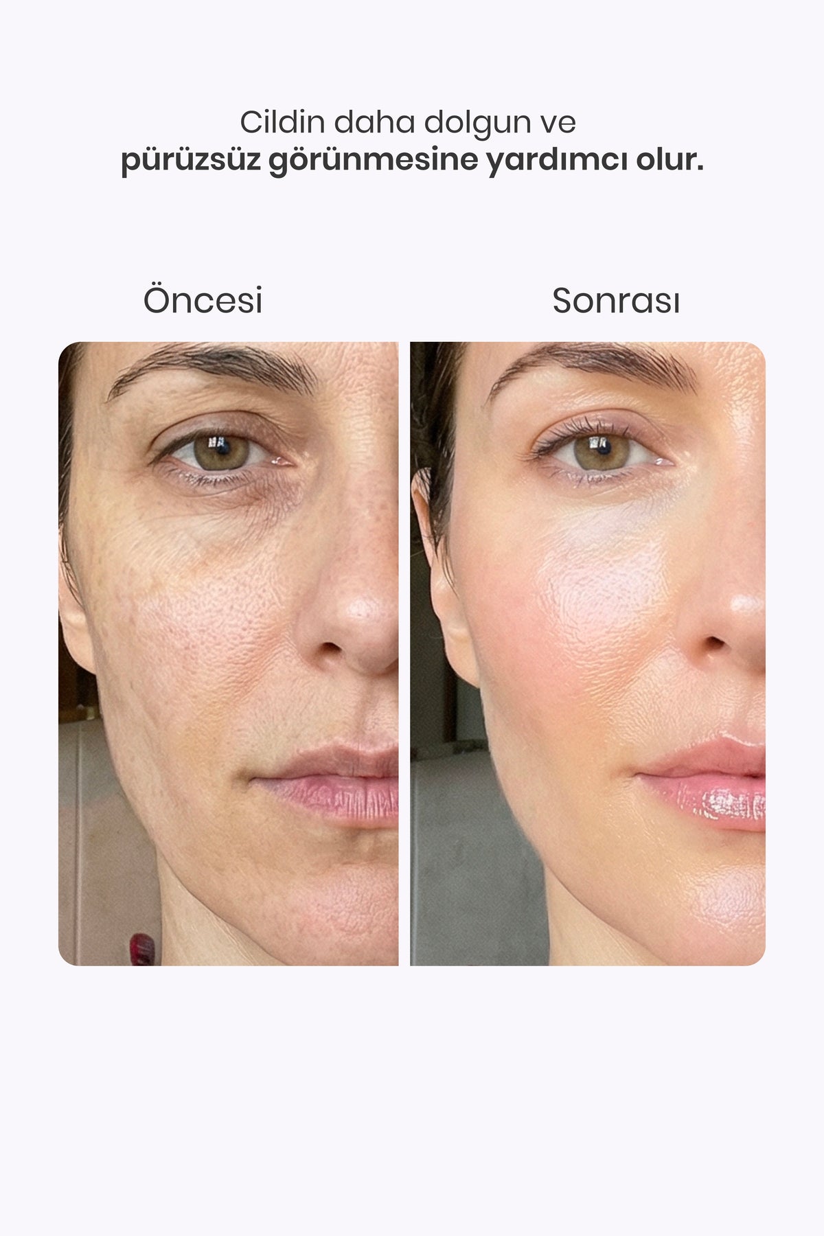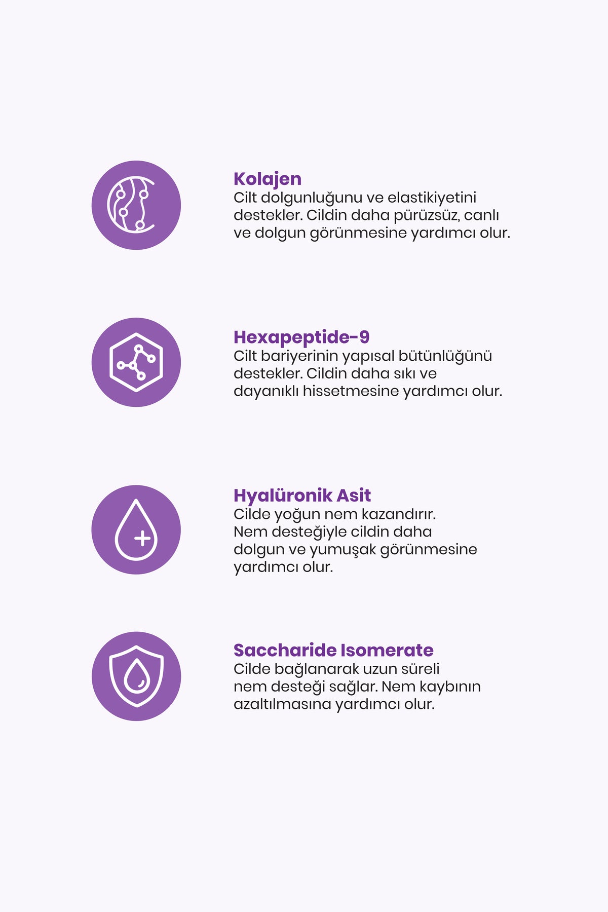 Kolajen içerikli bu özel formül, kırışıklık görünümünü azaltmaya, yeni kırışıklıkların ve sarkmaların oluşmasını önlemeye yardımcı olur. Nemlendirir, yumuşaklık verir. Cildin daha dolgun ve canlı görünmesine yardımcı olur. Nar ve üzüm çekirdeği özleri ile dış etkenlere karşı antioksidan koruma sağlar. Cildin tazelenmiş, yenilenmiş, ışıltılı ve pürüzsüz bir görünüme kavuşmasına destek olur.